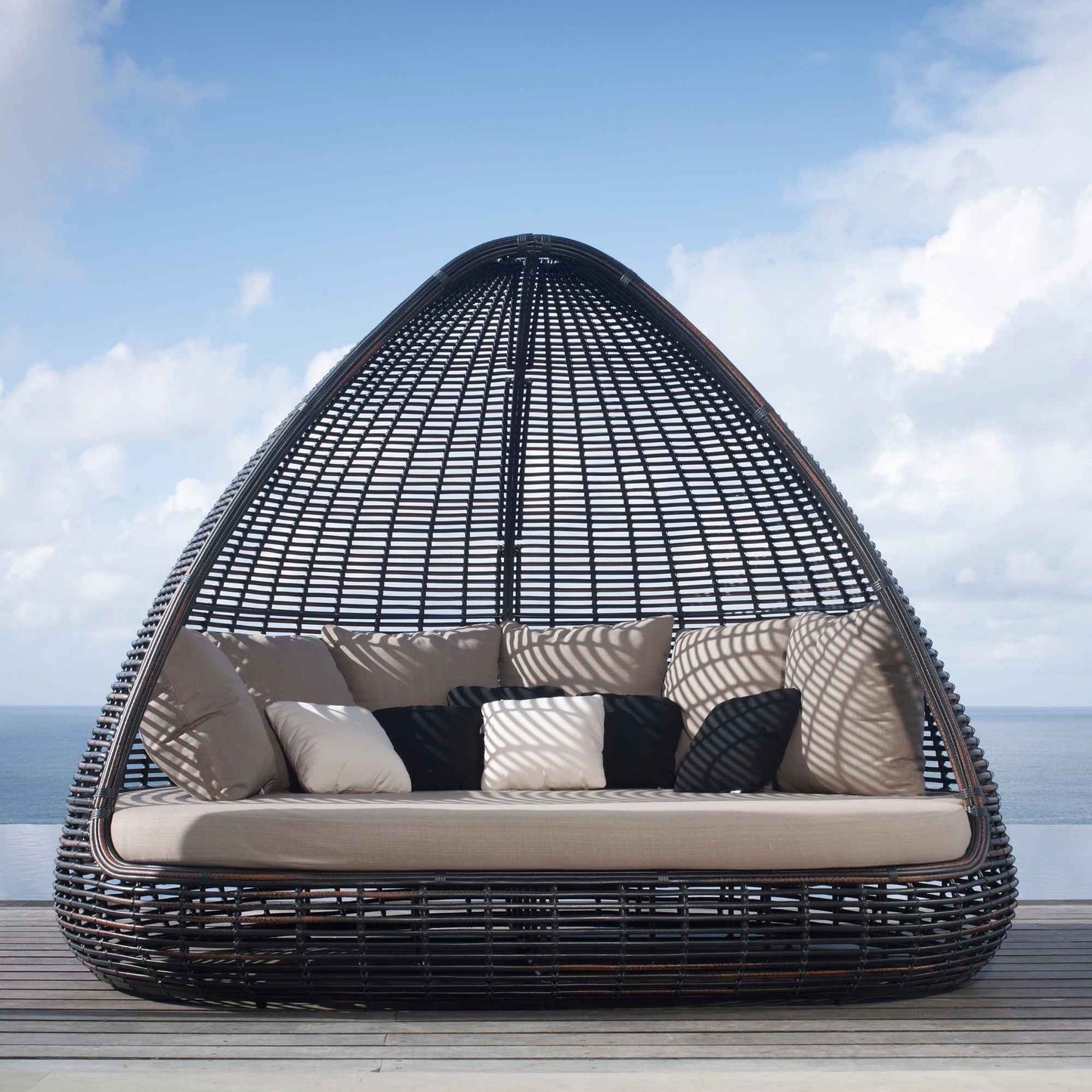 The Shade Daybed offers a perfect retreat for lounging outdoors in style. Featuring an arched woven canopy, this sculptural piece provides shade and privacy while plush Sunbrella cushions ensure all-day comfort. Built with a durable aluminum frame and handwoven synthetic fibers in a sleek Black Mushroom finish, it’s a luxurious centerpiece for any outdoor space.